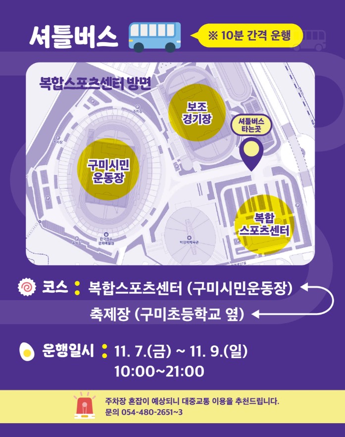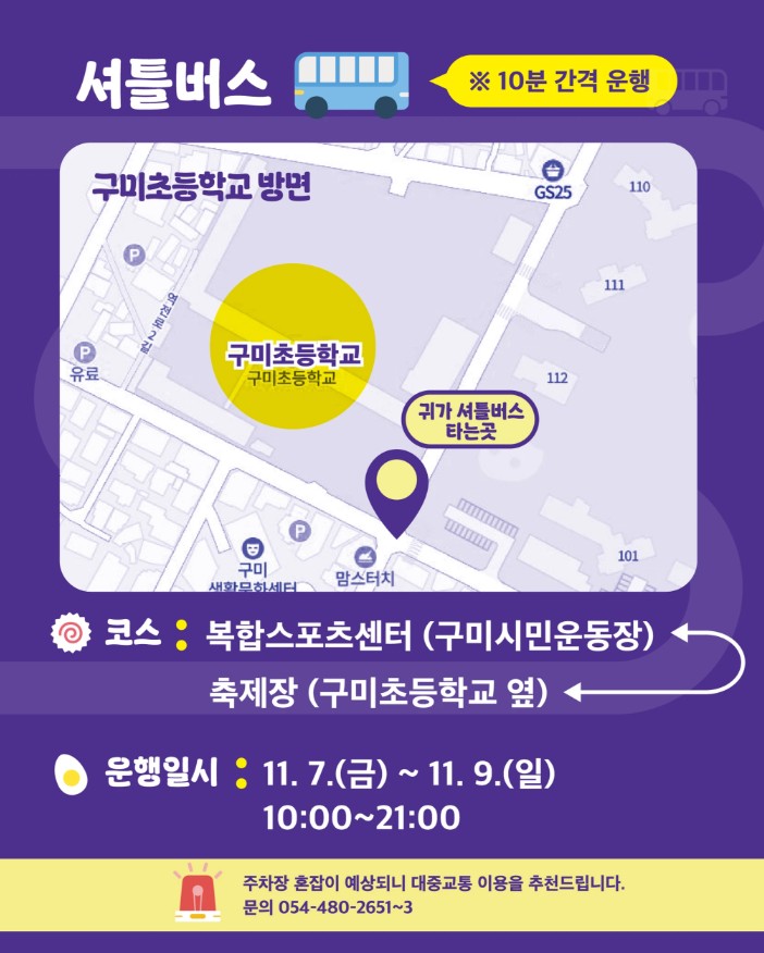 A2. 구미역에서 도보 3분 거리이며, 셔틀버스는 구미시복합스포츠센터(구미시민운동장)에서 축제장까지 축제기간 중 매일 오전 10시부터 오후 9시(9일은 오후7시)까지 10분 간격으로 운행됩니다.