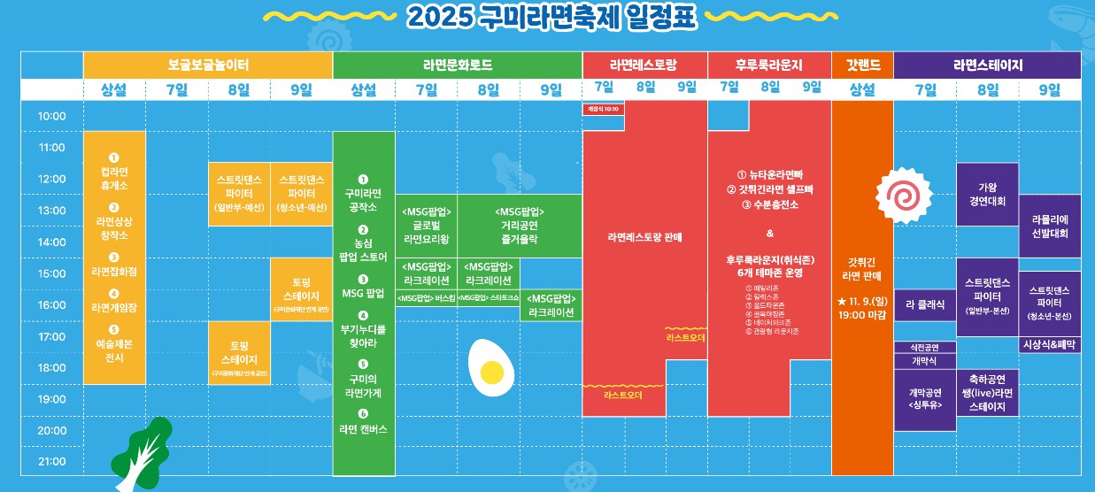 올해 축제는 11월 7일부터 9일까지 3일간 구미역 일원에서 열립니다. 행사장에서는 ‘라면레스토랑 거리’, ‘쌩(Live)라면 스테이지’, ‘스트릿댄스파이터 저지’ 등 다채로운 프로그램이 준비되어 있습니다. 존박, 노라조, 울랄라세션 등 인기 아티스트가 참여하는 공연과 함께, 현장에서 갓 튀긴 라면을 맛볼 수 있는 특별한 기회도 제공됩니다.